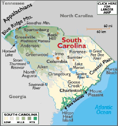 Among the 13 major Sea Islands in the Atlantic off South Carolina are Bull, Sullivans, Kiawah, Edisto, Hunting, and Hilton Head, the largest island (42 sq mi—109 sq km) on the Atlantic seaboard between New Jersey and Florida. The total boundary length of South Carolina is 824 mi (1,326 km), including a general coastline of 187 mi (301 km); the tidal shoreline extends 2,876 mi (4,628 km). The state’s geographic center is located in Richland County, 13 mi (21 km) SE of Columbia.