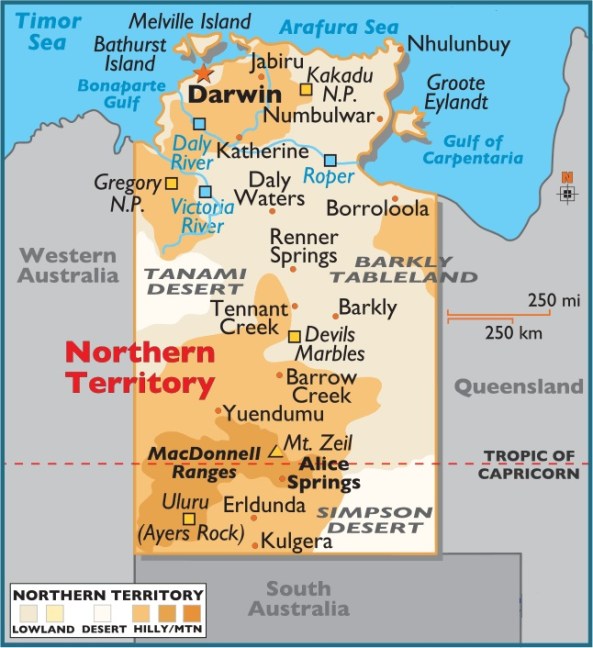 Largest Cities: (by population) Darwin, Alice Springs, Palmerston, Katherine, McMinns Lagoon
