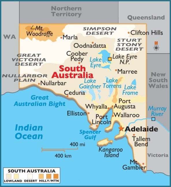 South Australia is the fourth largest of Australia’s states and territories, and is composed of an arid to semi-arid terrain giving way to low mountain ranges.
