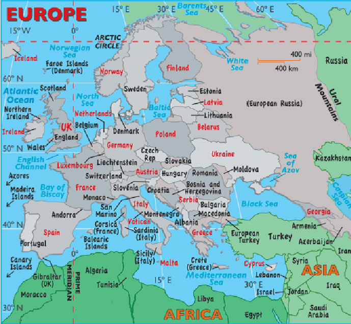 The European continent, bordered by numerous bodies of water, is separated from Asia by Russia’s Ural Mountains and by the Caspian and Black Seas. It is separated from Africa by the Mediterranean Sea.